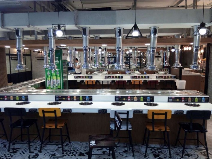 業主可根據自身情況可進行裝修,客人用餐臺面可用大理石或實木裝修,設備還可根據業主餐廳布置的要求,來做不同形狀,其價格合理,外觀精美,無噪音等特點。旋轉小火鍋設備